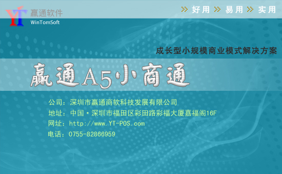 ●科学完善的盘点业务系统提供科技、完善、严格的盘点业务流程,科学的盘点方式,真正实现不停业盘点,提高盘点的效率和准确性;系统支持各种条码采集器进行盘点录入,同时支持前台POS机的盘点功能。 ●支持报损,领用等多种其它出入库方式,成本价调整方便仓库商品成本控制。 ●采用行业通行的移动平均加权法核算库存成本,提供报损,领用等多种辅助出入库方式,准确高效; ●所有出入库都增加了批次号的录入/选择功能,严格管理商品保质期。 3.3 会员营销,强效个性 ●融合会员卡、积分卡及储值卡的一卡通消费模式,系统自动采用会员价和会员折扣两套价格,不同级别会员优惠额度也不同,储值卡支持实时网络方式和IC卡方式,数据采用双重加密,保证数据的安全性。支持批量发卡,支持跨店、异地消费,支持会员消费跟踪,支持会员生日、消费以手机短信通知。 ●各种各样的会员促销方式,支持多种条件选择,制作促销。也可以选择几种促销进行组合,来灵活的管理。 ●使用经过改良的报表设计器来设计报表,并开发强大的数据“自定义汇总方式”,可任意生成自已想要的报表可保存不同的报表样式,节省不少时间,同时可使用全面的报表部署功能,让其它朋友和您一起共享个性化报表乐趣。 ●全能的报表查询报表中心提供了有关进货,销售、库存、成本、往来、帐务、固定资产、人事工资等一系列报表,覆盖面广,统计方法科学,数据准确。所有的报表和基本资料均可导入EXCEL中进行分析加工,以满足用户的更高的要求。 ●全智能万能查询器在系统内各处都配有,其性能绝对超一流,不需用户输入关系符和逻辑符,还可以自定义查询条件。使信息查询灵活多样,极为方便。 3.5 打印格式,随心所欲 ●赢通报表的表格生成功能,可以自动帮助客户生成表格,真正的以出色的可视化技术创建吸引人的打印样式。 ●开放式的打印设计让您可以对单据/报表的外观进行设计(包括对格式、字体、边框、背景等的设计),而且可以设定报表内部数据的计算方法(包括对数据来源的设定、数据算法的设定等)。 ●赢通特有的打印缩放、数据过滤功能能使报表打印所需数据所见即所得,支持快捷键打印和预览打印。 3.6 数据存储,安全稳定 ●赢通A5商业管理软件采用了微软SQL2000/2005大型关系型数据库,超级容量,适合企业海量存储,报表查询极快。前台使用FireBird数据库支持,性能稳定,数据交换速度快,自动备份机制和复制技术。 ●独有的档案跟踪功能可以查看到档案创立人,方便档案的管理。 ●本系统与赢通软件老版本有高度的兼容性,系统自带智能升级程序,免去了手工升级的繁琐。 ●独有的锁定功能可以锁住各种档案不被其它帐户修改,保障资料安全。 3.7 系统维护,方便快捷 ●系统随时监控收银机的工作状态;可向前台发送消息下达通知及帮助解决故障;软件具备自动升级功能,保证软件自动及时更新,方便维护,节省成本。 ●采用最新的通讯监控手段,后台可以实时监控前台的收银状况和和设备状态。 ●提供开业清库,数据整理,数据转移,确保数据稳定安全。 ●大图标设计,适合不同年龄段人群,易学易用易上手。 ●智能化的安装包、升级设计,可自动判断当前的版本与安装包来决定是否更新。全自动升级方式,无需手工干预。可以在线智能升级。 3.8 超级前台系统 ●前台模块化设计,各显示标题均可以自定义,完全开放式显示,适应个性化需求。 ●前台支持全键盘操作,扫描、刷卡、结帐全键盘操作完成,提升前台收银效率,很适合快速收银。 ●断电保护,当交易还未完成时,突然断电。下次打开时该交易数据依然存在。前台可脱网单机运行,当网络连通后会自动将数据上传服务器中,断网后功能依然强大。 ●DOS仿真方式,界面简单明了,屏幕颜色自定义,个性化设计。 ●支持市场上所有主流 POS 机和POS 外设。 ●前台为初学者提供练习收银,方便熟悉前台。 ●支持助记码,货号,条码输入收银。