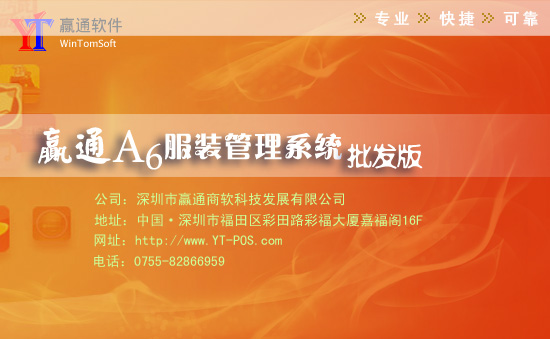 升级后的赢通A6服装管理系统批发版更加贴合品牌专卖行业特性、并融入多年来全国近100,000家用户实际运用经验,在易用性与智能化方面进行了创新,优化管理流程,为企业建设更为稳健实用的信息化平台。 系统主要突出了以下几个方面的特色: