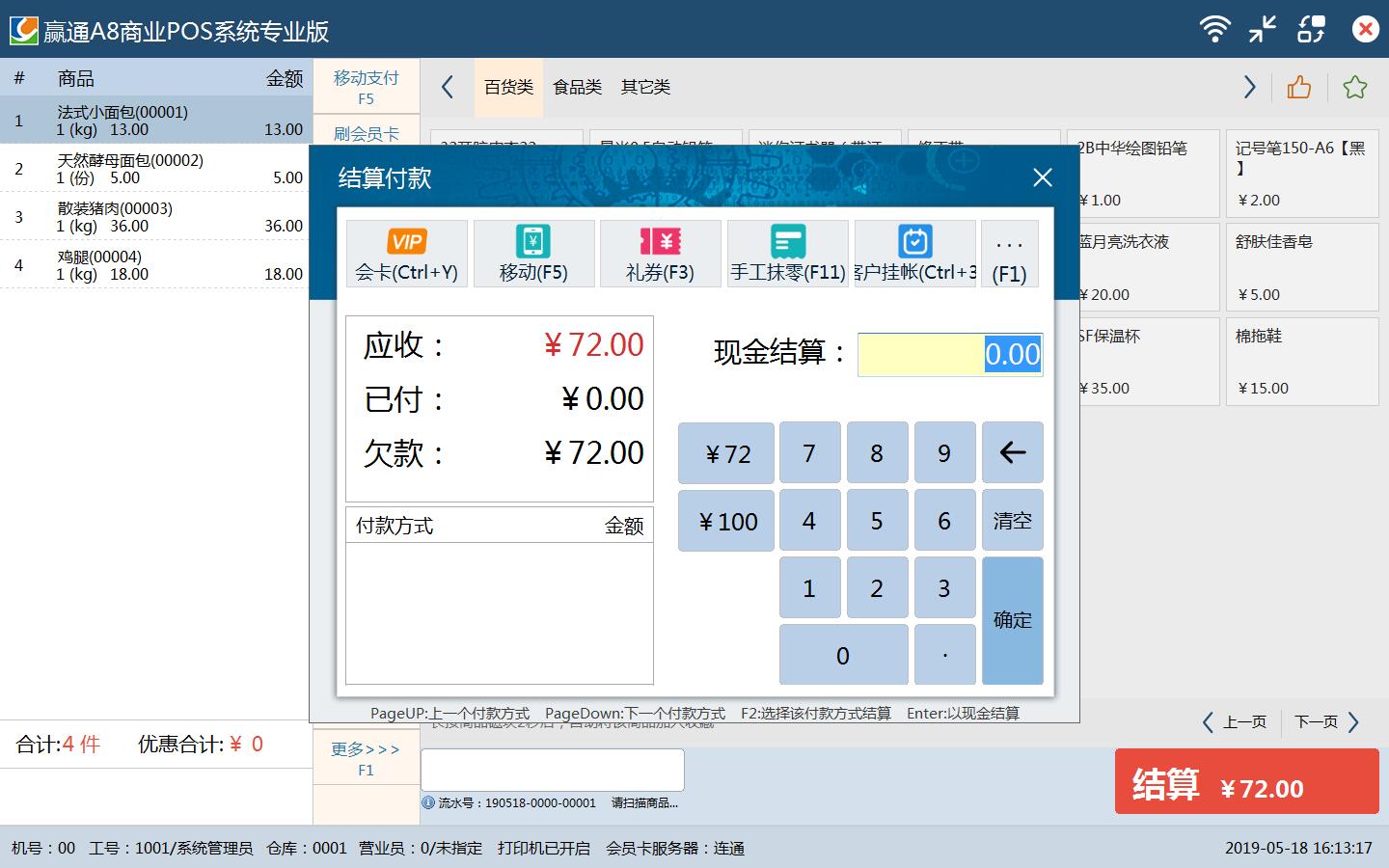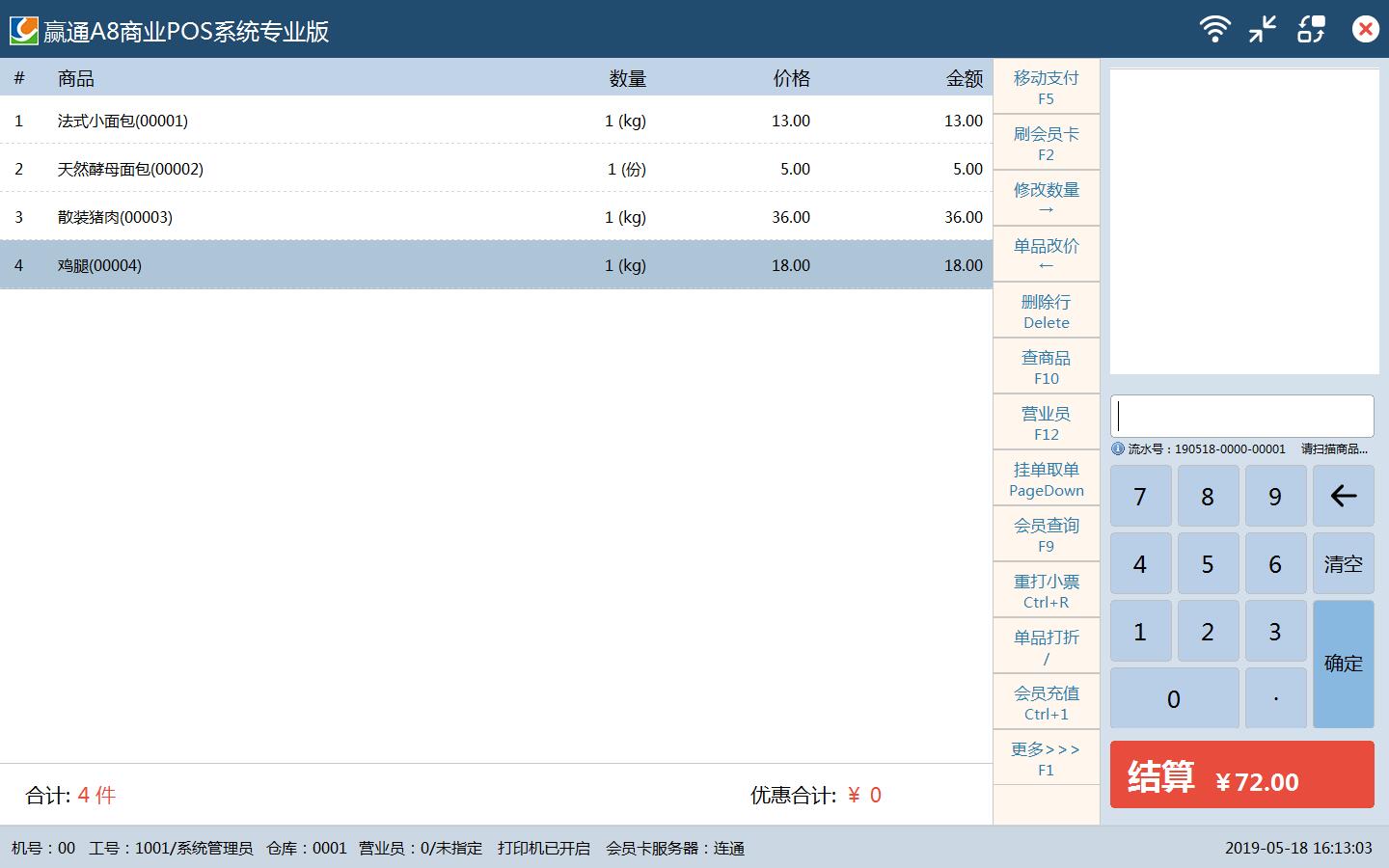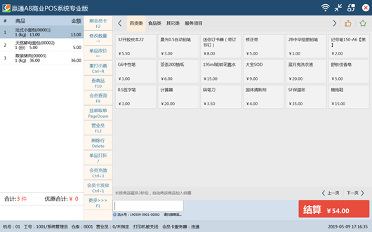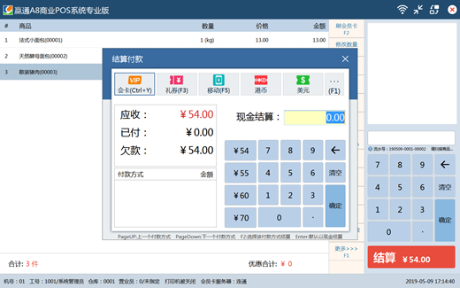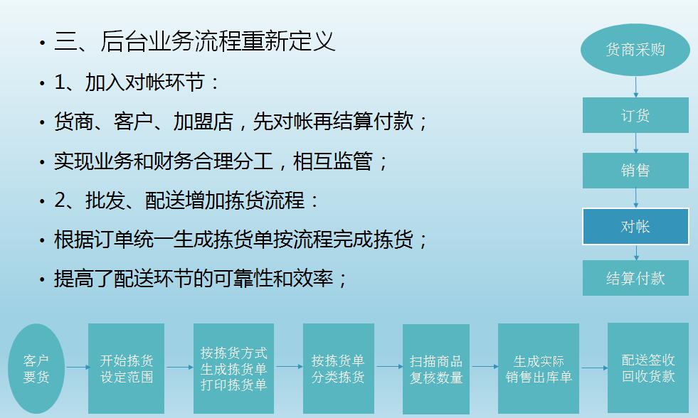 三、后台业务流的重新定义 1、加入对帐环节:货商、客户、加盟店,先对帐再结算付款,实现业务和财务合理分工,相互监管 2、批发、配送增加拣货流程:根据订单统一生成拣货单按流程完成拣货,提高了配送环节的可靠性和效率 ![]() 四、高效简洁的收银前台 适合各类收银机,各类分辨率显示屏,同时支持全键盘、键盘+鼠标、全触摸屏操作方式 支持普屏和触屏一键自由切换,支持联网及断网收银 多支付方式支付,安全可靠的赢通移动支付,更方便高效 练习收银模式,随时随地可对员工进行收银培训及练习,界面更友好,操作更流畅