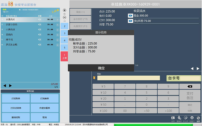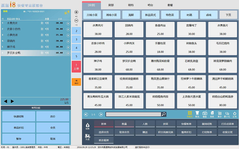 ●界面功能优化,不同状态不同颜色,方便识别; ●前台速度加快,点餐下单秒下,高低配机器均可; ●支持排号系统,顾客自助或服务员排号,支持语音叫号; ●多种出品对应厨部方式供选择,打印机实时监控及反馈,不掉单、漏单,28种厨打单据可配,支持厨部屏显; ●台房、快餐、外卖多种模式自由搭配,触摸屏、键鼠操作自由选择,功能及热键自定义,严格的权限管理模式,完整的撤消操作日志; ●前台功能完整,开台、加台、搭台、换台、拆并单、点餐、出品转台、制法口味选择、知会、催、起菜、划菜、埋单、结帐、撤消…; ●支持服务费分时计价、临时菜、自选套餐、海鲜称重;物料成本全程管理,库存实时预警,支持出品沽清; ●电脑、IPAD、安卓平板、点菜宝设备可任意搭配使用;支持来电宝、计重称、顾显、钱箱、打印机外设; ●提供全场折扣、出品特价、单品赠送、超额优惠、积分翻倍...多种促销,前台支持改价、打折,会员优惠;
