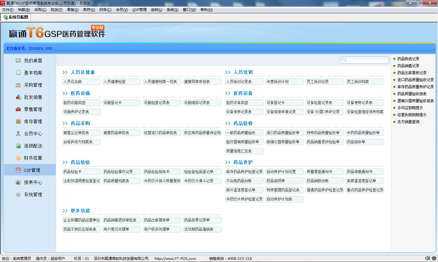赢通T6医药管理系统专业版主界面: