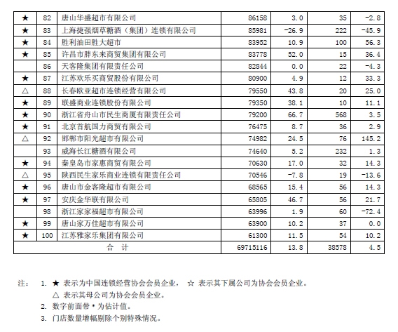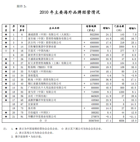 中国连锁经营协会“2010年度行业发展状况调查”日前结束,“2010中国连锁百强”今天发布。