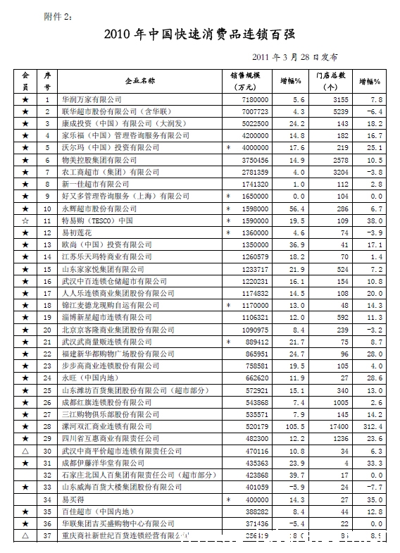 附件二:2010年中国快速消费品连锁百强