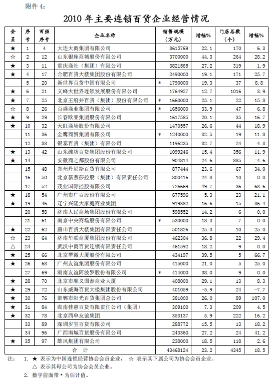 附件四:2010年主要百货连锁企业经营情况