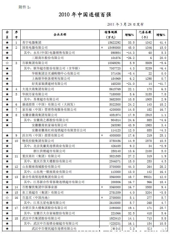 附件一:2010年中国连锁百强