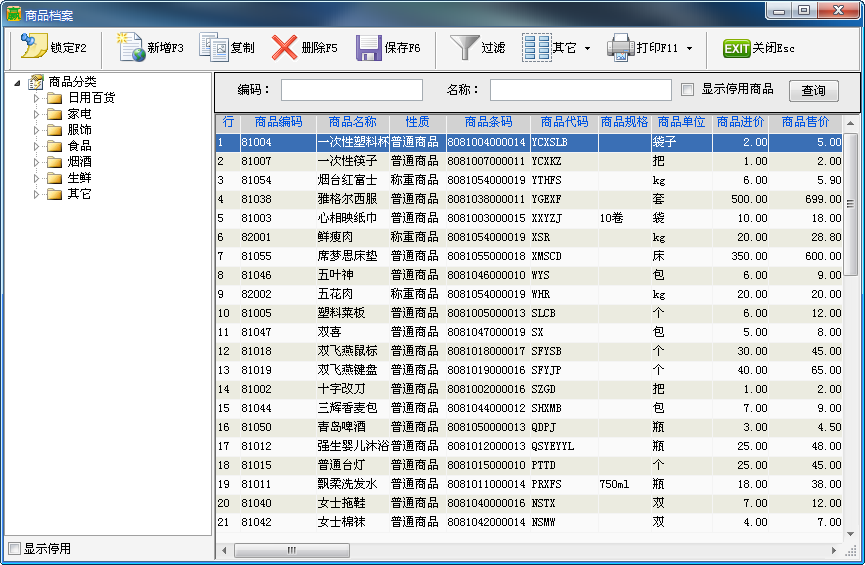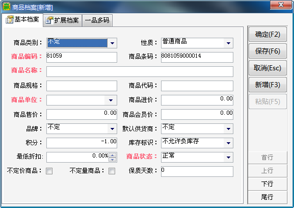 商品性质:分为普通商品、计重商品、计份商品、打包商品、服务商品。计重商品和计份商品用于条码电子秤计算打预包装条码标签,以便前台按预包装条码标签收银。打包和服务商品,采用是不计数量,手工输入数量;或者不计价格的方式,手工输入价格方式管理。