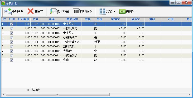 打印条码:即用来打印商品条码,常用于前台收银使用。
