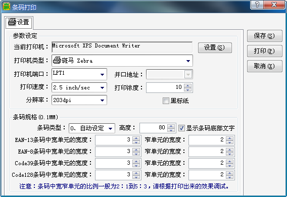 ![]() 对照条码打印机说明书设置相关参数,最后点击[打印]打印条码标签。