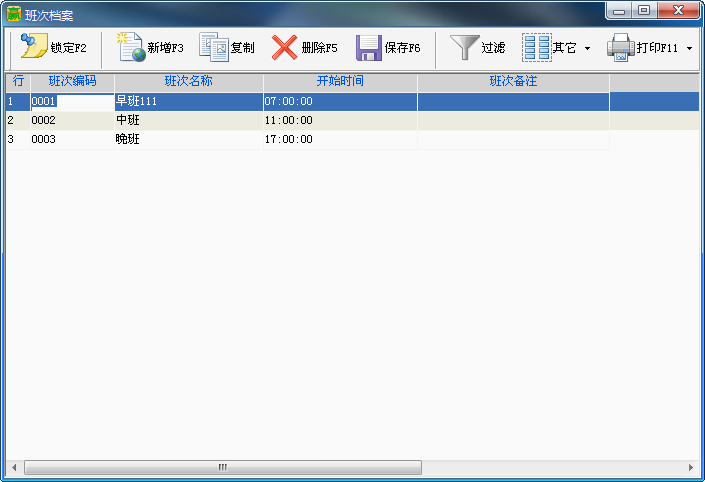 您可以在”主界面”中顶部菜单项选”基本资料”-”班次设定”项进入本模块,如下图: