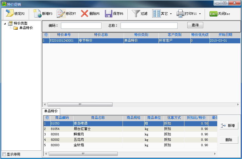![]() 操作方法:先新增特价单,再在下面新增特价明细。