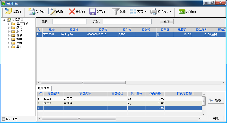 ![]() 操作方法:先新增特价打包单,为特价包指零售价、会员价,包条码(用于前台扫描),再在下面新增特价打包商品明细。