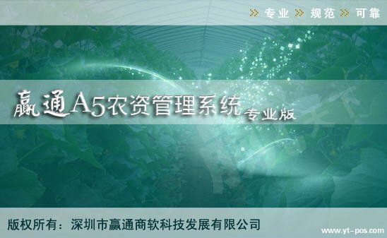 ★产品模块化设计,支持自定义报表,及计算列设置 ★支持无限级单位,同一内装数不同单位规格,多级拆零单位,各业务的单位自动换算 ★智能补货设计,支持自定义公式补货 ★支持批发代销管理,更适合业务员跟单 ★前台销售支持多种类型促销,也可以多种促销方式组合 ★支持市场上所有盘点机的数据导入及导出,可按全场,类别,品牌,货商,库位,单品来进行盘点 ★会员卡支持批量制作,发放,冲值。积分兑换,回访管理 ★财务流水帐管理,支持应收(付)款调增和应收(付)款调减,支持货商客户预付管理 ★支持毛利按收银员、时间段、供应商来查询 ★支持手机短信发送(会员业务操作、前台消费),也可以群发短信。其它辅助模块,隐藏功能 ★前台采用了小型关系型火鸟数据库(Firebird),功能更强大,数据稳定,仿DOS前台,支持断网收银 赢通A5农资主界面: