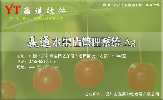 升级后的赢通水果店管理系统A3更加贴合品牌专卖行业特性、并融入多年来全国近10,000家用户实际运用经验,在易用性与智能化方面进行了创新,优化管理流程,为企业建设更为稳健实用的信息化平台。 系统主要突出了以下几个方面的特色: 1. 重新构架了整体框架,加入了现在流行的管理方式 产品特色 针对水果店管理,更专业 ●提供全业务导航图浏览,方便使用模块,能记录常用的业务模块提取使用。 ●SQL2000数据库提供了大容量数据管理,多机使用,稳定可靠。 ●大图标设计,适合不同年龄段人群,易学易用易上手。 库存管理,准确严谨 ●科学完善的盘点业务系统提供科技、完善、严格的盘点业务流程,科学的盘点方式,真正实现不停业盘点,提高盘点的效率和准确性,同时系统支持各种条码采集器进行盘点录入。 ●支持报损,领用等多种其它出入库方式,成本价调整方便仓库商品成本控制。 客户管理,强效个性 ●融合会员卡、积分卡及储值卡的一卡通消费模式,系统自动采用会员价和会员折扣两套价格,不同级别会员优惠级别也不同,储值卡数据采用双重加密,保证数据的安全性。支持会员挂失,积分兑换。 促销方式,灵活多样 ●各种各样的促销方式,支持多种条件选择,制作促销。也可以选择几种促销进行组合,来灵活的管理。 ●强大的查询功能针对基本档案、业务单据、业务报表,提供相应切近的查询工具;针对于不同性质的业务部门,提供特定需求的查询模块;针对单品,提供全业务跟踪式查询。支持预先设置报表条件,然后提取满足条件的数据。 ●丰富的报表管理及决策分析提供常见实用的分析报表,如业务排行、销售分析、收银统计,科学的数据分析为您提供决策的基础;系统还为高级客户提供灵活的自定义报表、直接的SQL查询及外挂特殊格式的报表文件。 ●全智能万能查找功能在系统内各报表均有,可以自定义查询条件,不需要输入复杂的关系表达式,可以查询指定的报表,信息查询极为方便。 打印格式,随心所欲 ●开放式的打印设计让您可以对单据/报表的外观进行设计(包括对格式、字体、边框、背景等的设计),而且可以设定报表内部数据的计算方法(包括对数据来源的设定、数据算法的设定等)。 ●赢通特有的打印缩放、数据过滤功能能使报表打印所需数据所见即所得,支持快捷键打印和预览打印。 系统维护,方便快捷 ●提供开业清库,数据整理,数据转移,确保数据稳定安全 ●针对于系统所有模块,可设置多层权限控制(查看/更改/审核);针对于系统数据,可设置数据级的权限控制,在整个系统中,确保每种角色和每个员工只可操作自己权限范围的项目品项;针对于进价敏感问题,可更进一步设置每个员工的进价操作权限;针对于安全监控后备,系统全程记录每个操作员的操作日志,确保防而不漏,有据可查。 数据存储,安全稳定 ●赢通商业管理软件A3专业版采用微软大、关系型数据库SQL2000支持,性能稳定,数据交换速度快,支持自动备份机制和复制技术。 ●独有的档案跟踪功能可以查看到档案创立人,方便档案的管理。 触摸式前台系统 ●前台支持市场上主流触模屏,能随不同的分辨率自动调整显示,而不影响显示效果。 ●前台为模块化设计,各种显示标题都可以自定义,完全开放式显示,适应个性化需求。 ●前台支持全键盘操作,扫描、刷卡、结帐全键盘操作完成,提升前台收银效率,很适合快速收银。 ●支持市场上所有主流 POS 机和POS 外设。 ●前台为初学者提供练习收银,方便熟悉前台。 ●支持助记码,货号,条码输入收银。交班撤消。