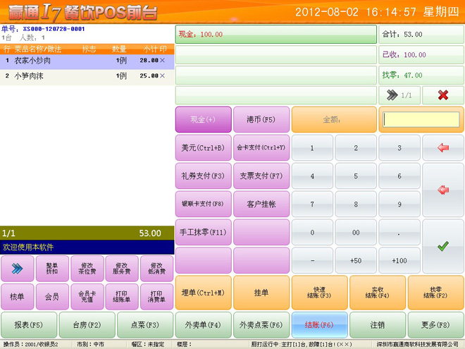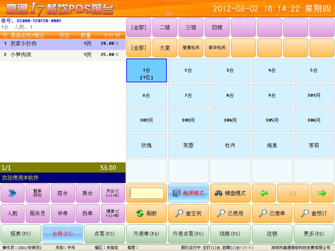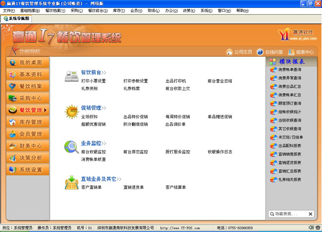 4. 支持导航图、流程图自定义,支持模块搜索,完全自定义的管理软件。 ![]() 5. 支持多业态管理,中餐、西餐、快餐管理一体化,企业更灵活扩张业务,适合长期发展。 6. 菜品、物料可以同时管理重量和数量,双管齐下。以乌龟为例,既可管理乌龟数量,又可以管理乌龟重量,确保数量、重量管理。 7. 前台采用全新点菜界面,苹果ios风格,触摸使用更顺手,特有的前台报表,不用开后台就可知晓当天业绩。 ![]() 8. 支持多种点菜宝和市场主流的厨打设备,特有厨打监控,可以监控到打印前状态,确保不掉单。 ![]() 9. 即将推出赢通I7餐饮win8平板无线点菜,集合电子菜谱、触摸屏点菜、点菜宝于一体,除了其功能强大外,简洁低调的界面风格,完美烘托出客户的高端性。 赢通I7餐饮管理系统主界面: