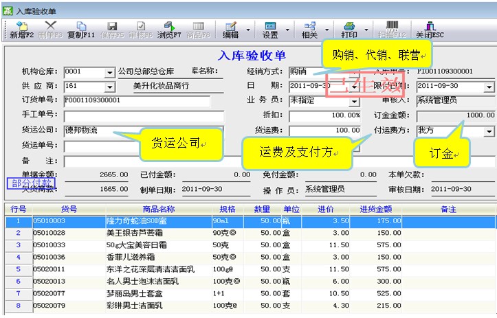 进货管理系统主要核算企业采购货品的业务过程。从订单开始直到收款全面的采购业务均可通过系统完成。与供应商协商(购销/代销/联营)确定关系时录采购订单;