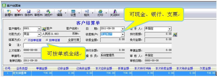 ![]() 到了收款时可以销售收款中反映各客户应收款的减少情况;零星的货款两清销售应在现款销售中完成相应的单据;