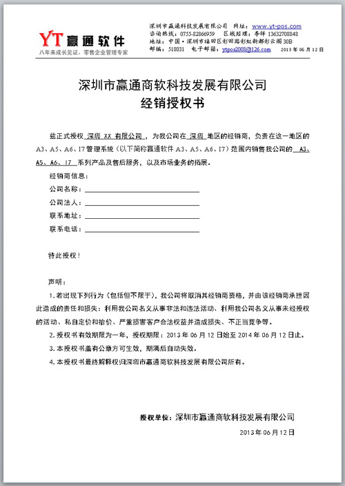 五、为防止消费者因受误导而上当受骗,请消费者到我公司授权合作伙伴(以本授权书为准,加盖公章生效,下附格式)处购买赢通软件系列产品。如有疑问,请拨打:0755-82866959