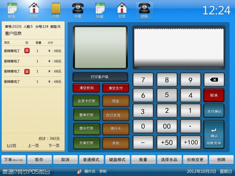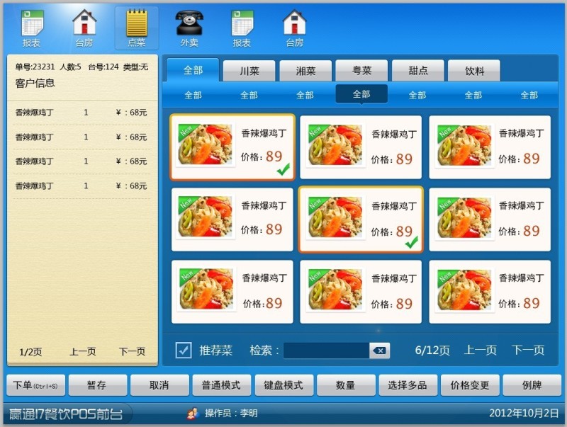 餐饮美食管理、我们更专业: ●出品、成品、物料有机结合;口味、做法、要求、状型更多选择;支持临时菜、自选套餐、称重; ●多种出品对应厨部方式供选择,打印机实时监控及反馈,不掉单,不漏单,28种厨打单据可配,支持厨部屏显; ●台房、快餐、外卖多种模式自由搭配,触摸屏、键鼠操作自由选择,功能及热键自定义,严格的权限管理模式,完整的撤消操作日志; ●前台功能完整,开台、加台、搭台、换台、拆并单、点餐、出品转台、制法口味选择、知会、催、起菜、划菜、埋单、结帐、撤消…; ●支持服务费分时计价、临时菜、自选套餐、海鲜称重;物料及成本全程管理,库存实时预警,并支持出品沽清; ●电脑、IPAD、安卓平板、点菜宝多种设备于一体,可任意搭配使用;来电宝、计重称、顾显、钱箱、打印机各类外设全面支持; ●提供全场折扣、出品特价、单品赠送、超额优惠、积分翻倍...多种促销方式,前台改价,打折,会员折扣,整单折扣; 进销存管理,规范精准: