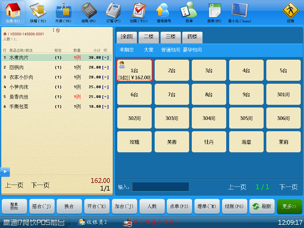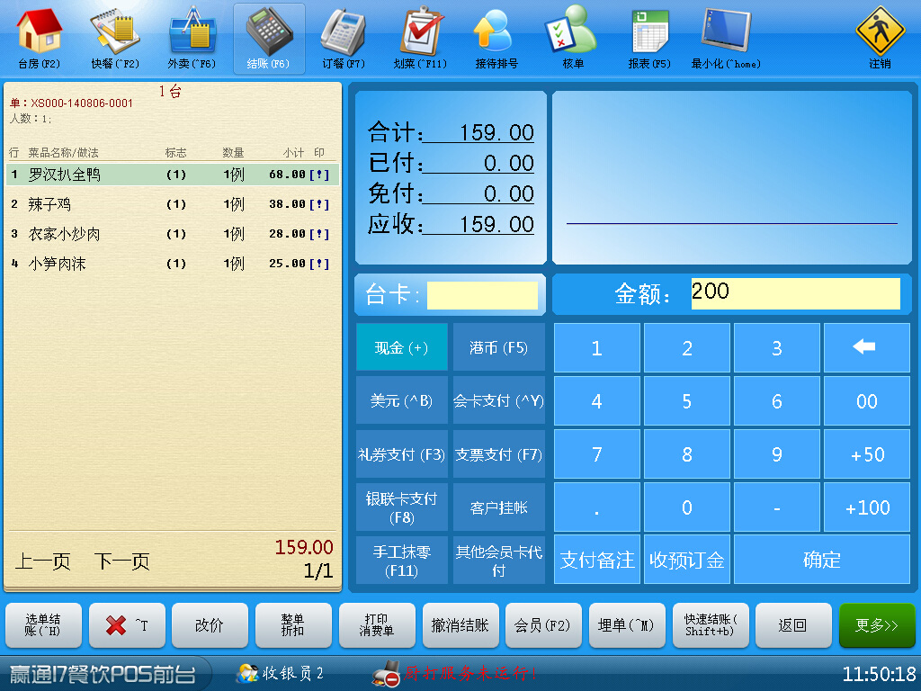 赢通I7餐饮管理系统专业版新界面正式上线! 餐饮美食管理、I7更专业: ●出品、成品、物料有机结合;口味、做法、要求、状型更多选择;支持临时菜、自选套餐、称重; ●多种出品对应厨部方式供选择,打印机实时监控及反馈,不掉单、漏单,28种厨打单据可配,支持厨部屏显; ●台房、快餐、外卖多种模式自由搭配,触摸屏、键鼠操作自由选择,功能及热键自定义,严格的权限管理模式,完整的撤消操作日志; ●前台功能完整,开台、加台、搭台、换台、拆并单、点餐、出品转台、制法口味选择、知会、催、起菜、划菜、埋单、结帐、撤消…; ●支持服务费分时计价、临时菜、自选套餐、海鲜称重;物料成本全程管理,库存实时预警,支持出品沽清; ●电脑、IPAD、安卓平板、点菜宝设备可任意搭配使用;支持来电宝、计重称、顾显、钱箱、打印机外设; ●提供全场折扣、出品特价、单品赠送、超额优惠、积分翻倍...多种促销,前台支持改价、打折,会员优惠;