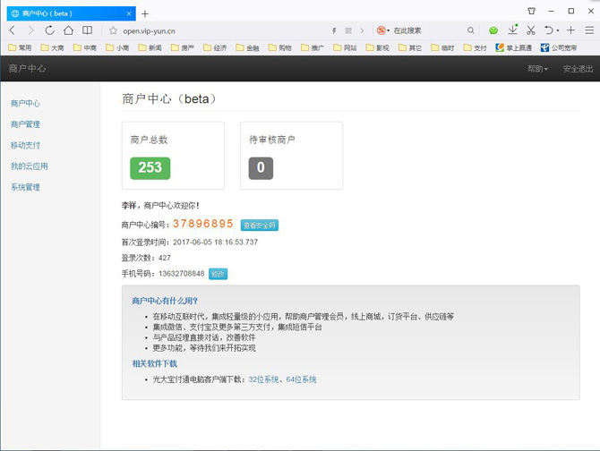 四、新版赢通云支付申请方法: 1. 合作伙伴只要绑定手机(在线注册的帐号)就可以一眼看到自己的商户数量,可以查询自己的商户情况: