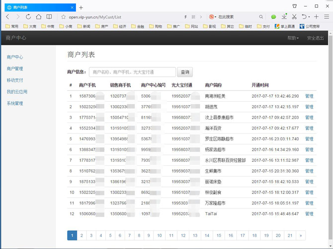 7. 在专用的商户平台,可以在商户平台查询管理客户商户情况,帮客户申请商户,管理短信、微信小程序等