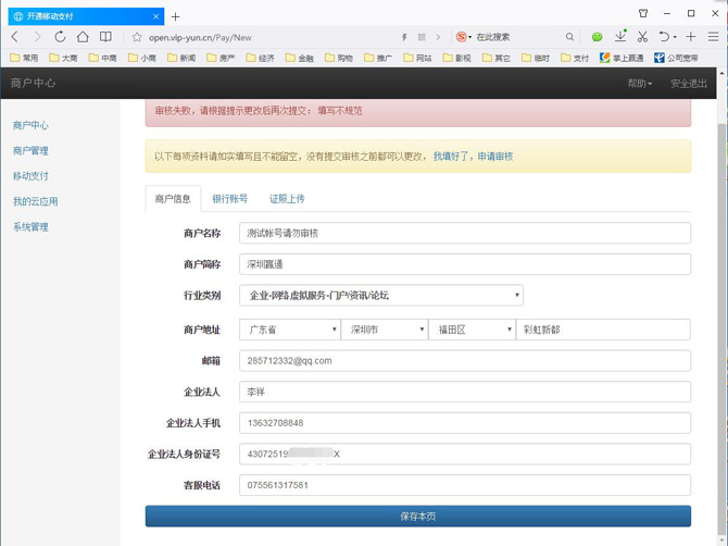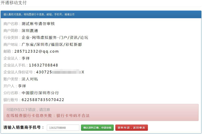 5. 提交审核界面智能化,如果银行卡号与银行名称不同会自动提醒: