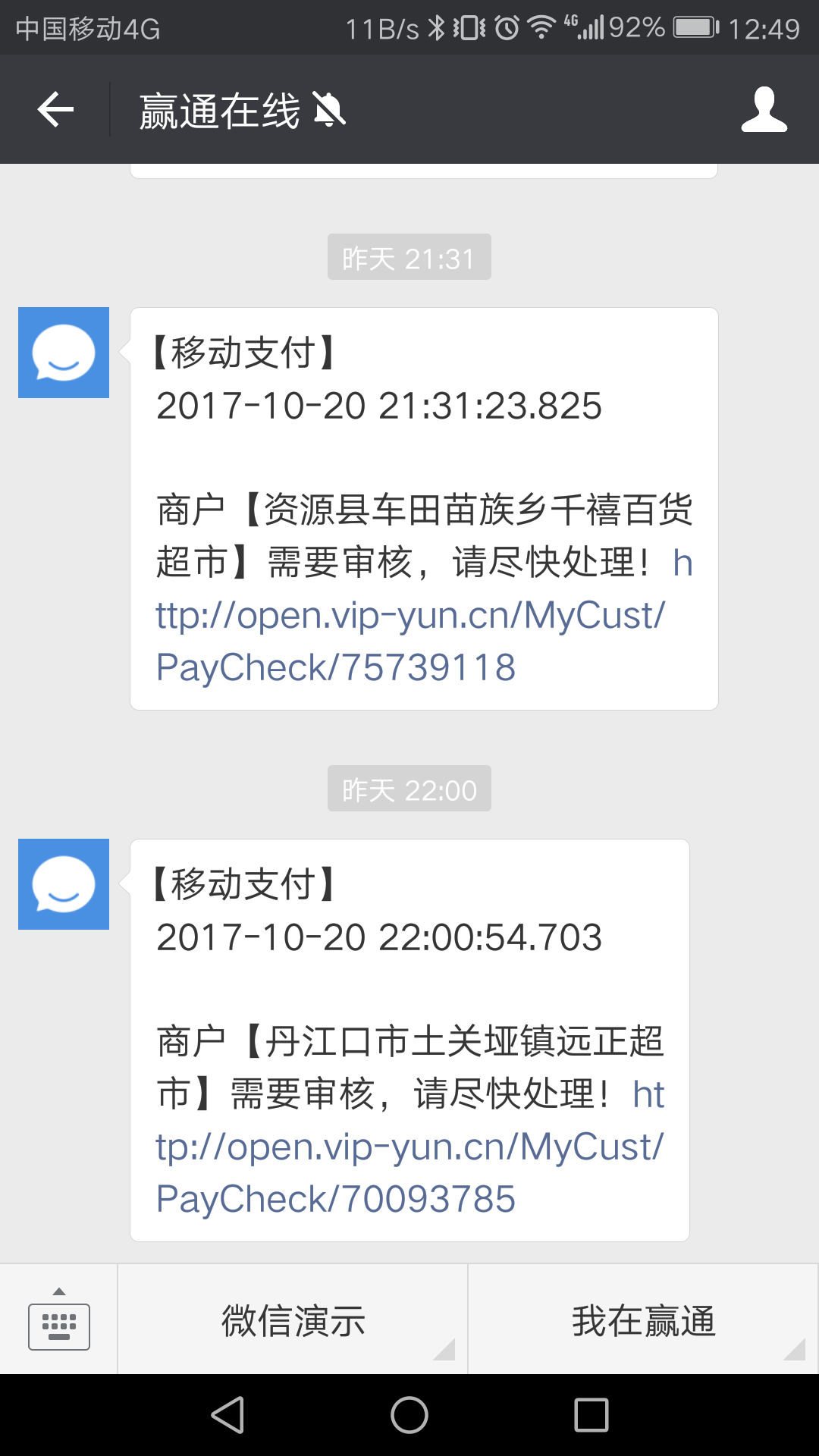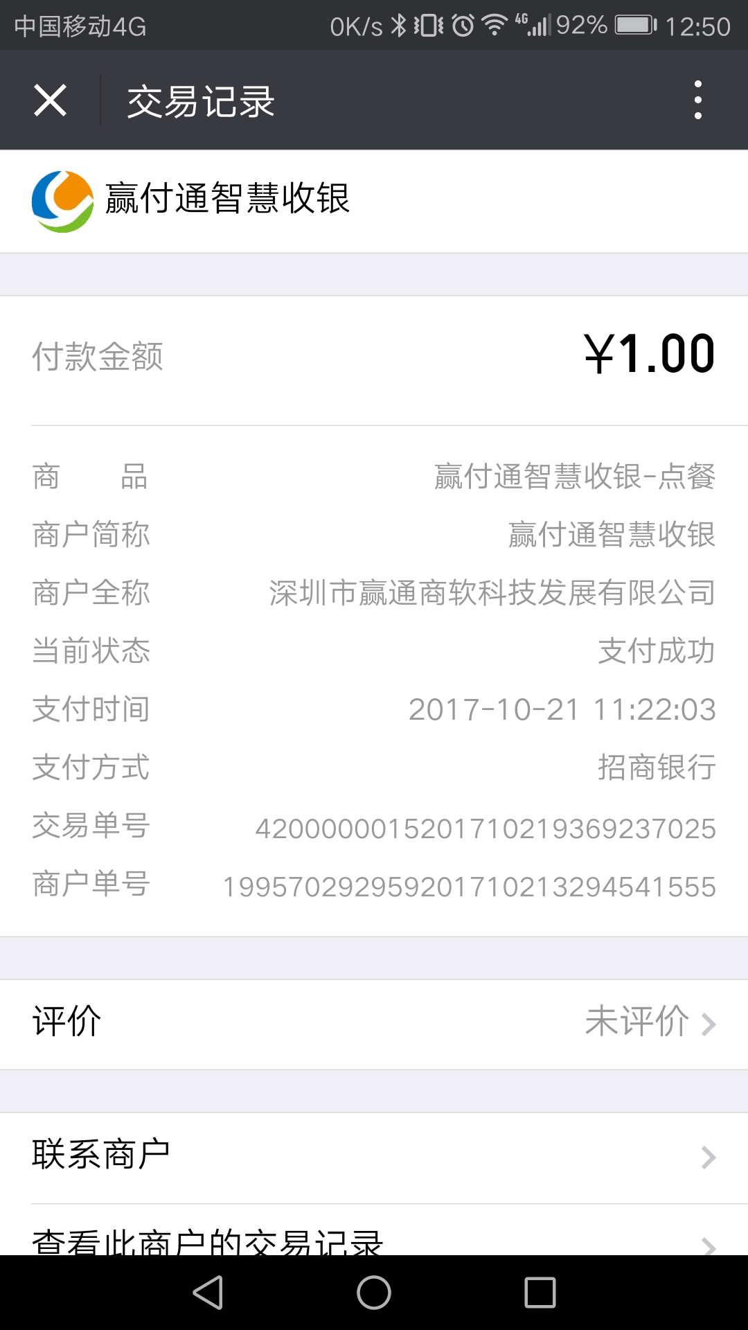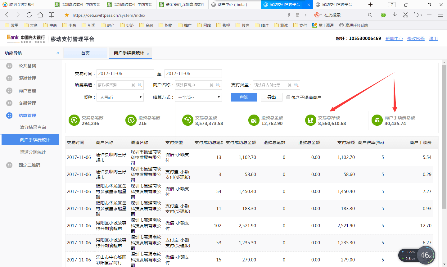 2017-11-06 与光大银行合作的新支付6月上线以来,移动支付增长迅速,目前赢通软件微信官方支付、支付宝官方支付、浦发银行移动支付(老融合支付)、光大银行移动支付(新融合支付,上图)单日支付量突破1000万!月交易3亿!新支付6月中旬上线以来,5个月就达到4000多家商户、800多万日交易量!