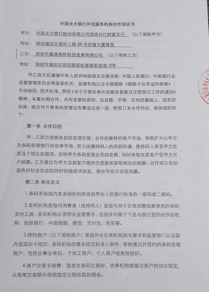 ![]() ![]() ![]() ![]() ![]() ![]() 7. 赢通软件同深圳光大银行进行签约合作,所以结算行为光大银行,由光大银行提供资金保障。由于银行与微信、支付宝有相关协议,微信、支付宝帐户可以通过协议从银行帐户进行付款提现操作,所以银行通过支付码也可以从微信、支付宝帐户中进行收款操作,支付费率相互有优惠,用于线下扫码支付非常安全、快捷。